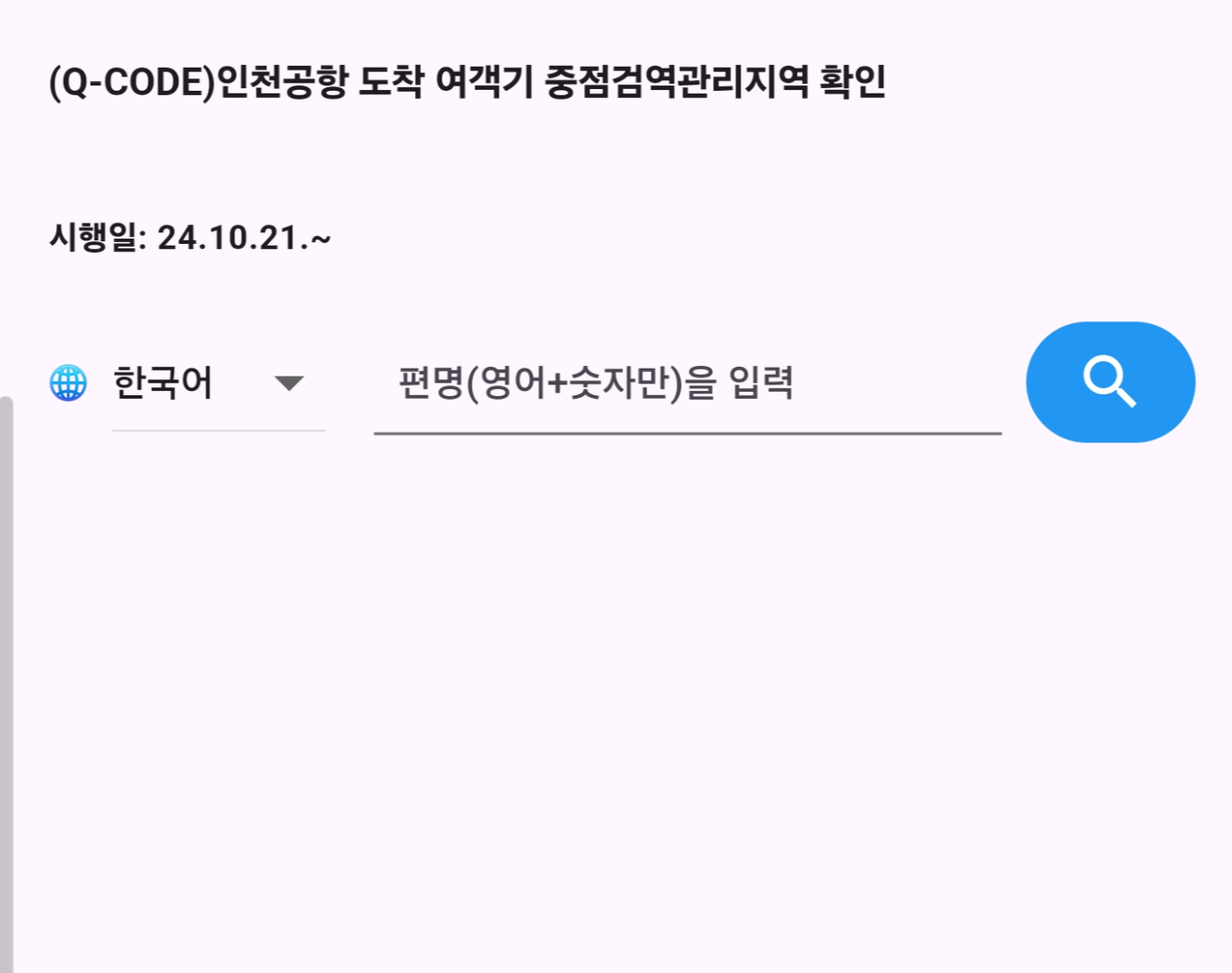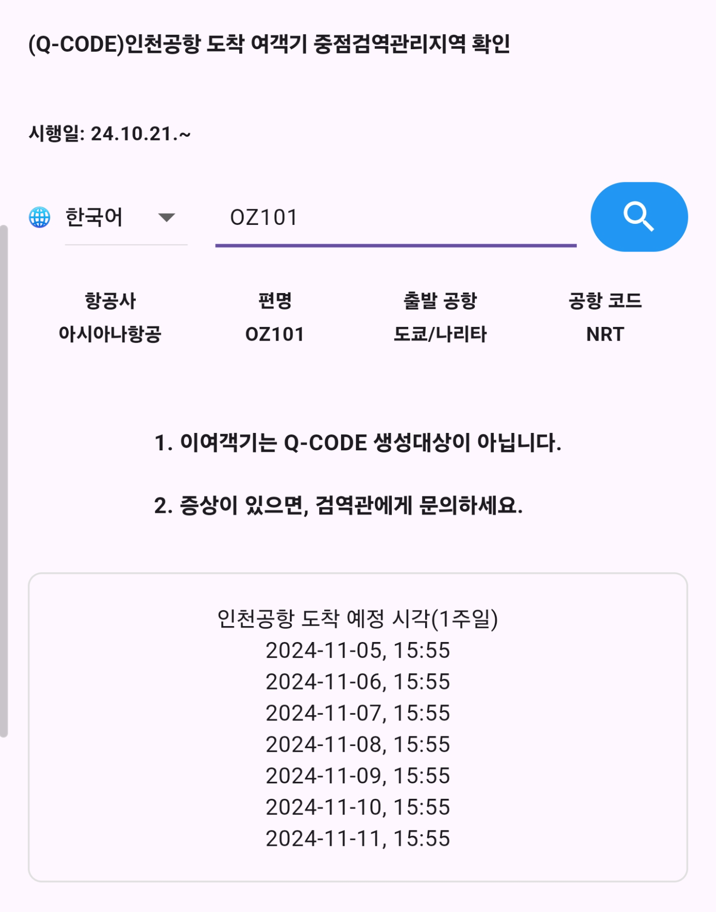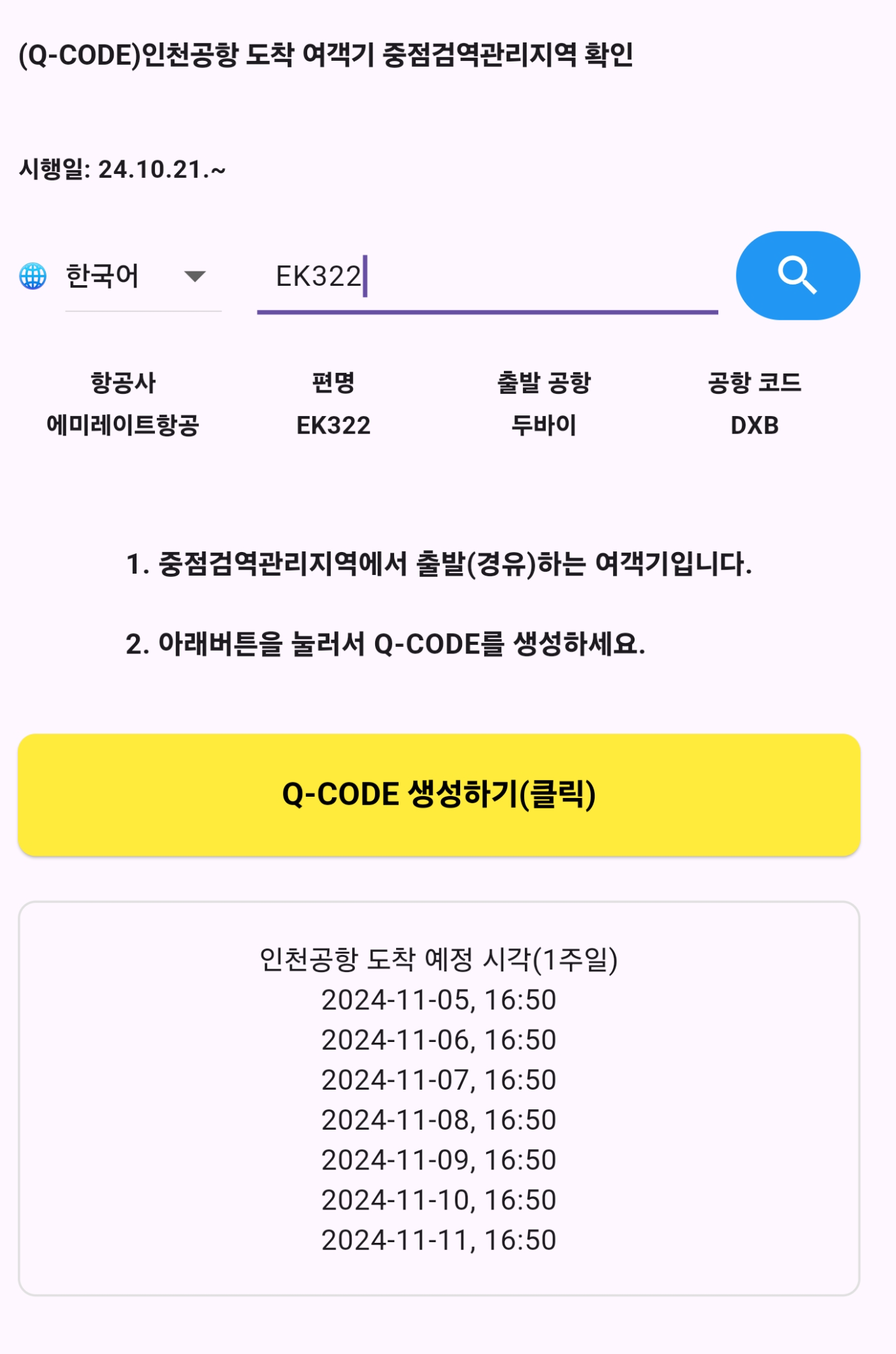 비행기 편명을 입력하여 중점검역출발 여객기인지 확인하는 앱을